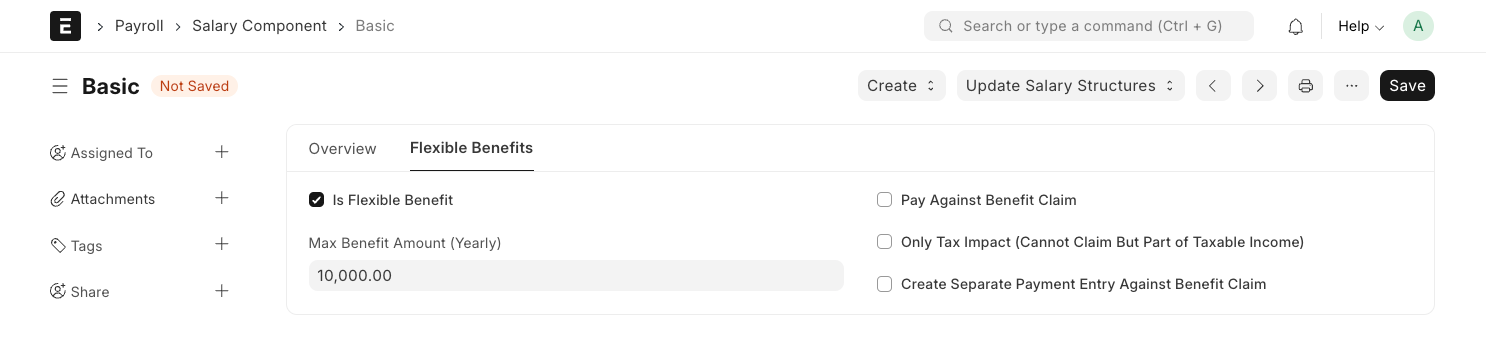 Esta sección se muestra si el componente de salario es un componente de ganancia. Los planes de beneficios flexibles permiten a los empleados aprovechar los beneficios que desean o necesitan de un paquete de programas ofrecidos por un empleador. Pueden incluir seguros de salud, planes de pensiones, gastos telefónicos, etc. Para establecer un componente de salario como un beneficio flexible, marque la casilla de verificación 'Es un beneficio flexible'.