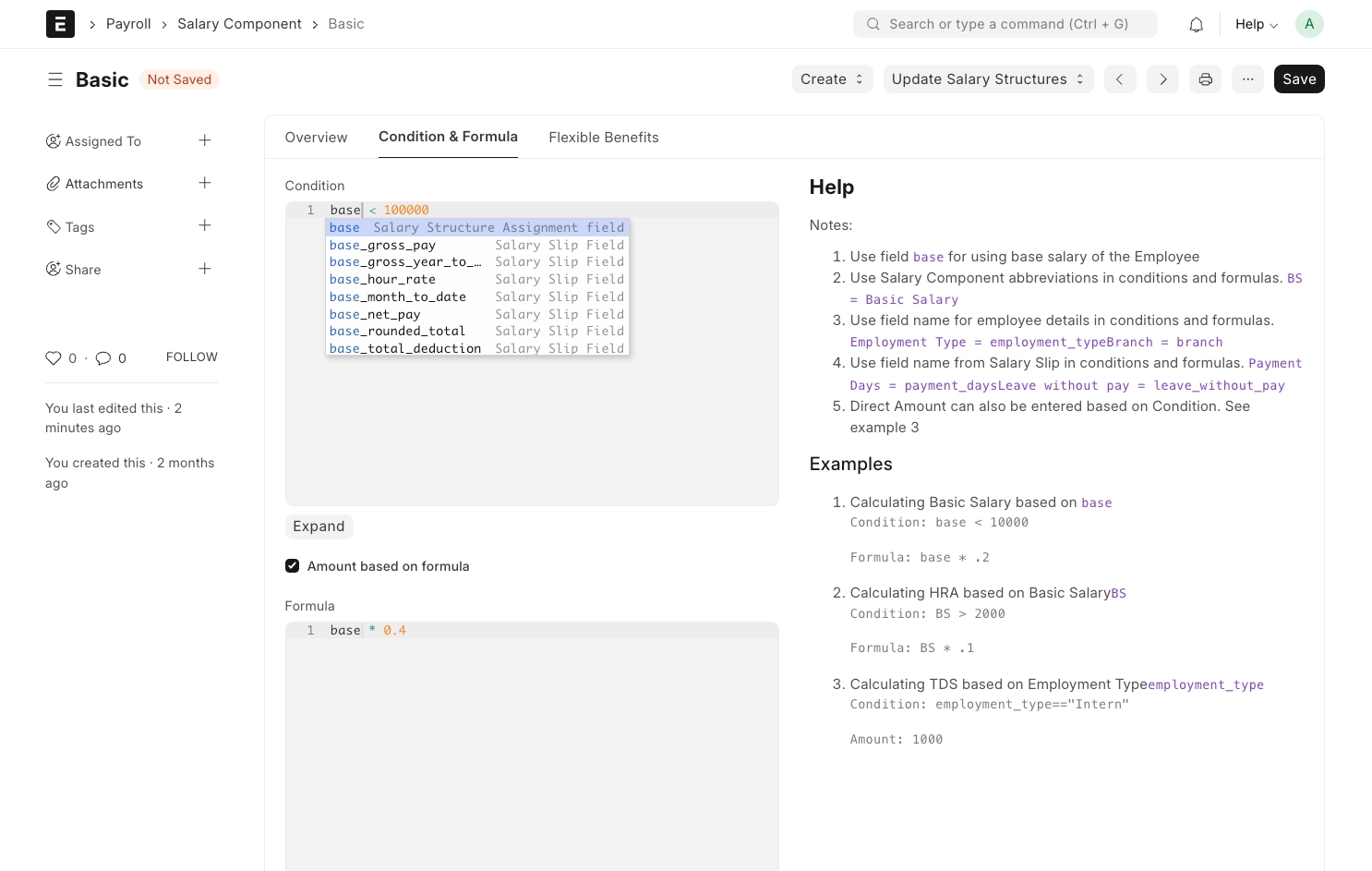 En caso de que el componente de salario se base en un monto predefinido, Frappe HR le permite ingresar directamente el monto en el campo Monto (desactive la casilla de verificación 'Monto basado en fórmula').