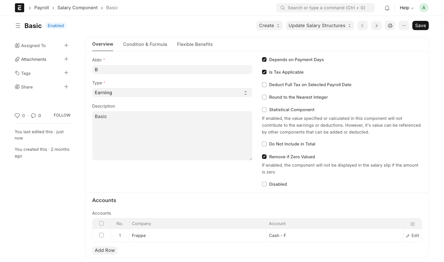 Nota: Esta configuración anterior es opcional. También se puede definir el importe y la fórmula/condición para un componente de salario directamente en la estructura de salario. Si se especifican en el propio documento del Componente Salarial, la información se obtendrá directamente en la Estructura Salarial cuando se seleccione el Componente.