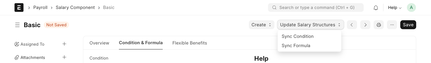 Puede sincronizar los valores actualizados de Condición y Fórmula de un componente salarial con las estructuras salariales existentes, donde se está utilizando el componente, con el botón Actualizar estructuras salariales.