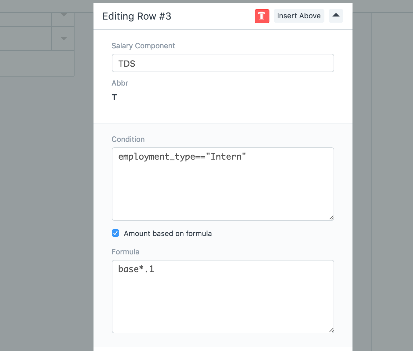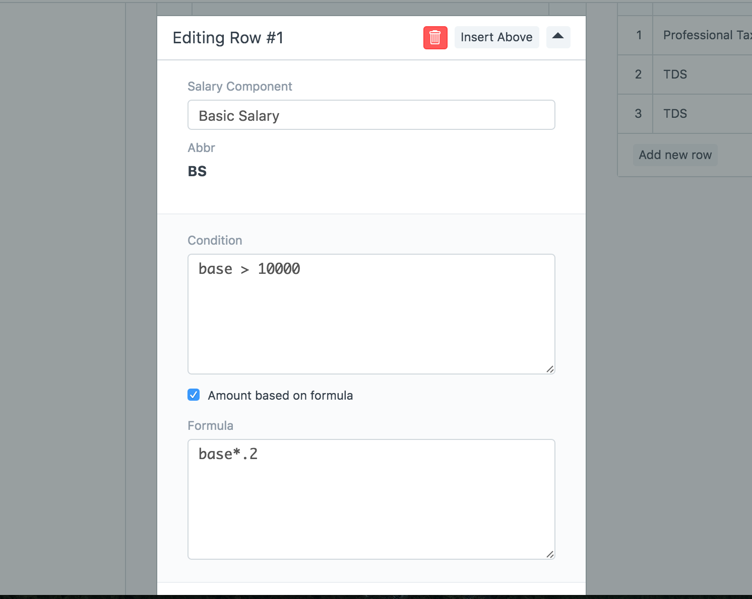 En las tablas "Ganancias" y "Deducciones", puede seleccionar los componentes de ganancias y deducciones. La condición y la fórmula configuradas en el componente Salario se copiarán de forma predeterminada, pero puede cambiar esto si es necesario. También puede seleccionar el componente Base en la tabla Ganancias. Tenga en cuenta que la cantidad elegible para cada empleado debe configurarse en Asignación de estructura salarial.