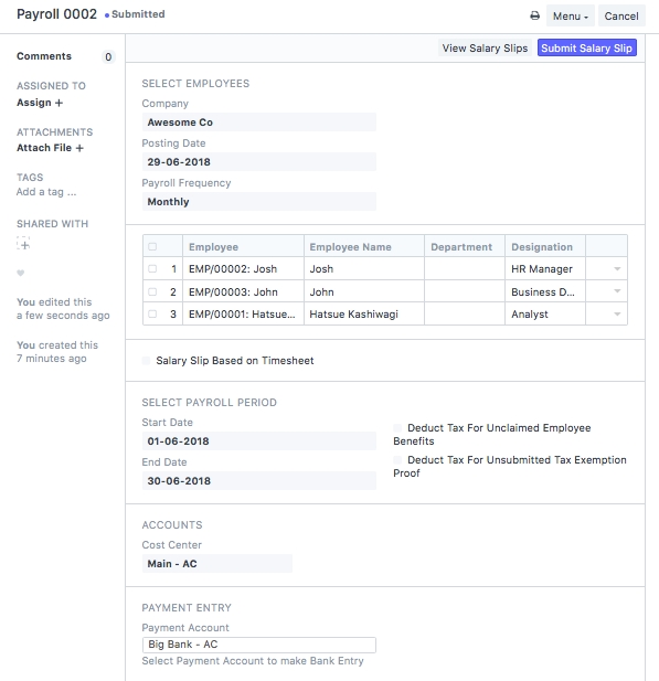 Guarde el formulario y envíelo para crear registros de recibo de sueldo para cada empleado activo durante el período de tiempo seleccionado. Si las Nóminas ya están creadas, el sistema no creará más Nóminas. También puede guardar el formulario como Borrador y crear los Recibos de Sueldo más tarde.