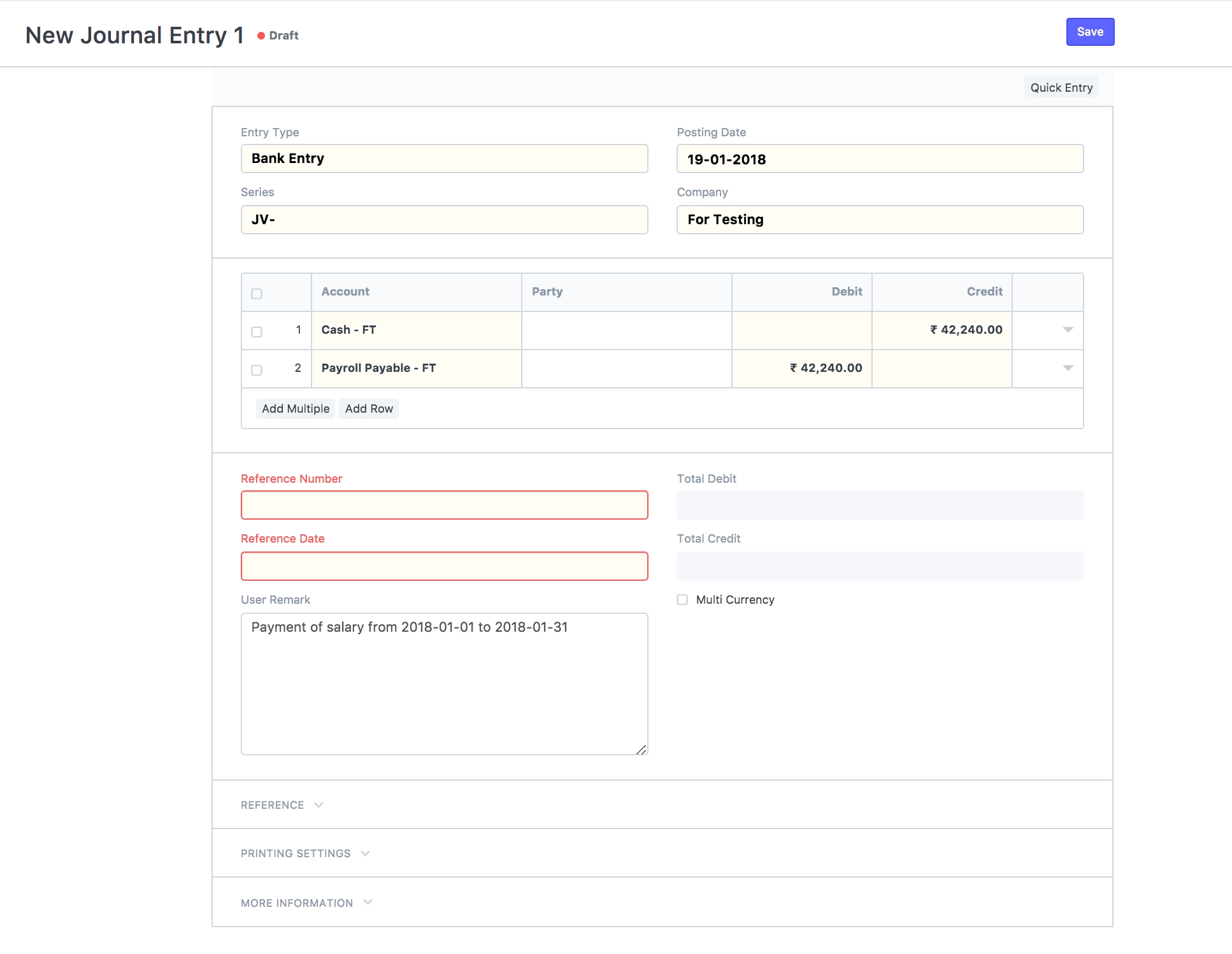 La entrada de nómina lo dirigirá a la entrada de diario con los filtros relevantes para ver los borradores de los comprobantes de diario creados. Deberá establecer el número de referencia y la fecha para las transacciones y enviar las entradas del diario.