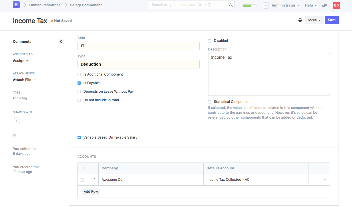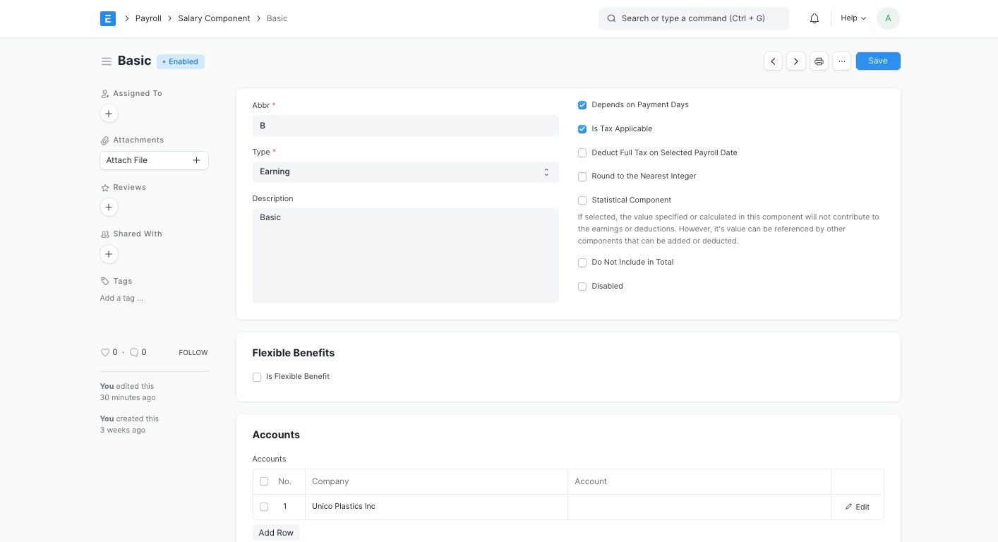 Este documento le permite definir cada componente de Ganancia y Deducción que se puede utilizar para crear una Estructura Salarial y posteriormente crear una Nómina o un Salario Adicional. También puede configurar el tipo, la condición y la fórmula, así como otros ajustes que se analizan a continuación. Debería poder habilitar varias combinaciones de las siguientes opciones para configurar cada componente según se adapte a las políticas de su empresa/región.