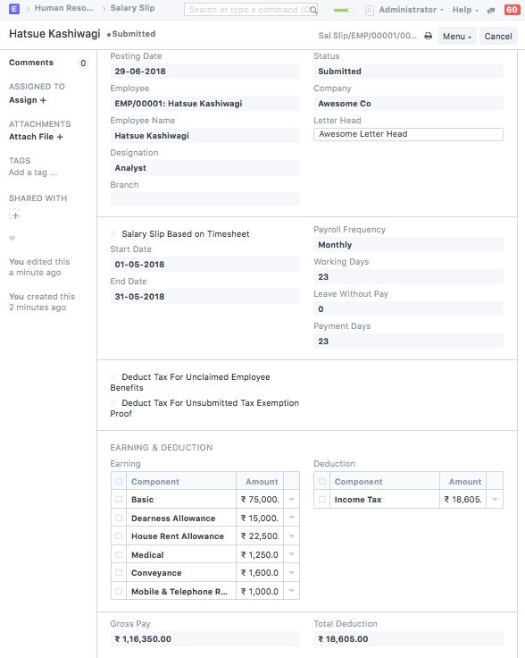 Si no desea que Frappe HR administre el LWP, deje el LWP sin marcar en todos los Tipos de ganancias y Tipos de deducción.