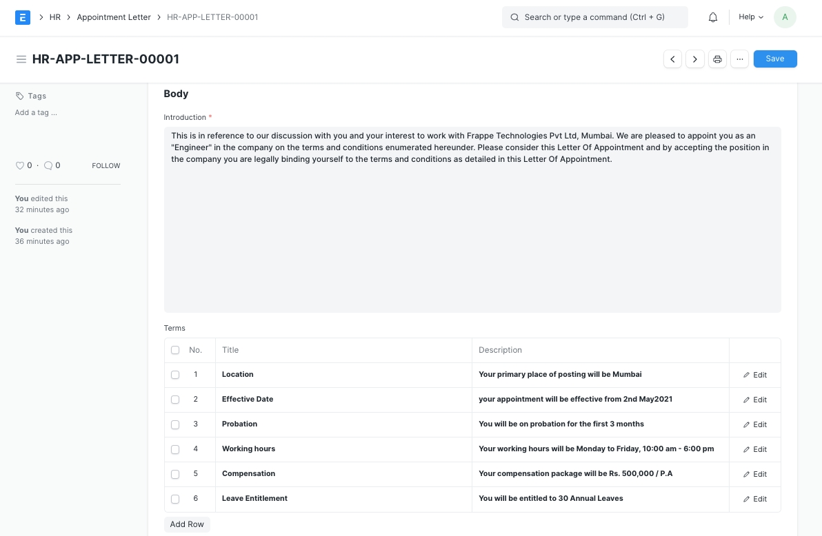 En el ERP puedes crear una Carta de Nombramiento que puedes entregar a los candidatos. Para acceder a la Carta de Nombramiento, vaya a: