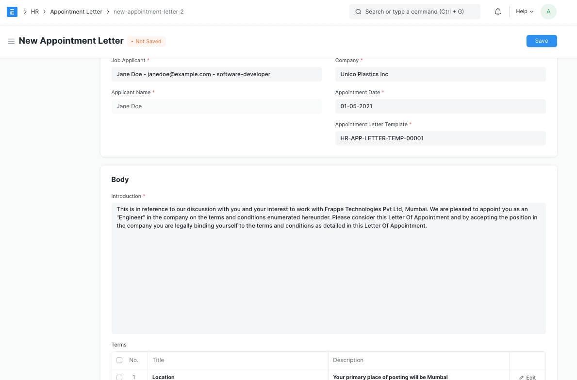 Puede completar manualmente la introducción, los términos y la declaración de cierre o seleccionar una plantilla de carta de cita para completar automáticamente el contenido. Puede crear nuevas plantillas de cartas de nombramiento para seleccionarlas fácilmente.