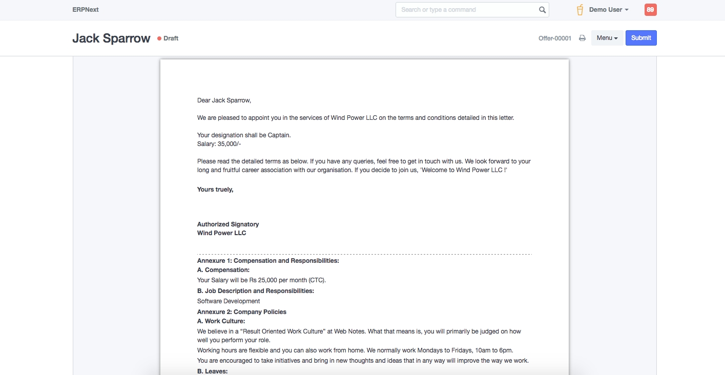 En esta sección, puede introducir el Término de la Oferta de Trabajo, como la descripción del trabajo, el período de preaviso, los incentivos, las vacaciones por año, etc. y especificar su Valor/Descripción.