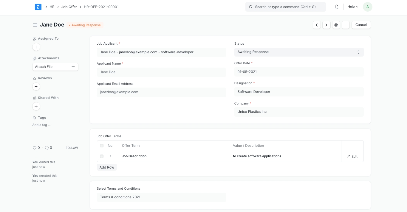 Todos los Términos y Condiciones relacionados con la Oferta de Empleo se pueden especificar en esta sección. Para ello, crea una nueva plantilla de Términos y Condiciones y vincúlala a la Oferta de Trabajo.