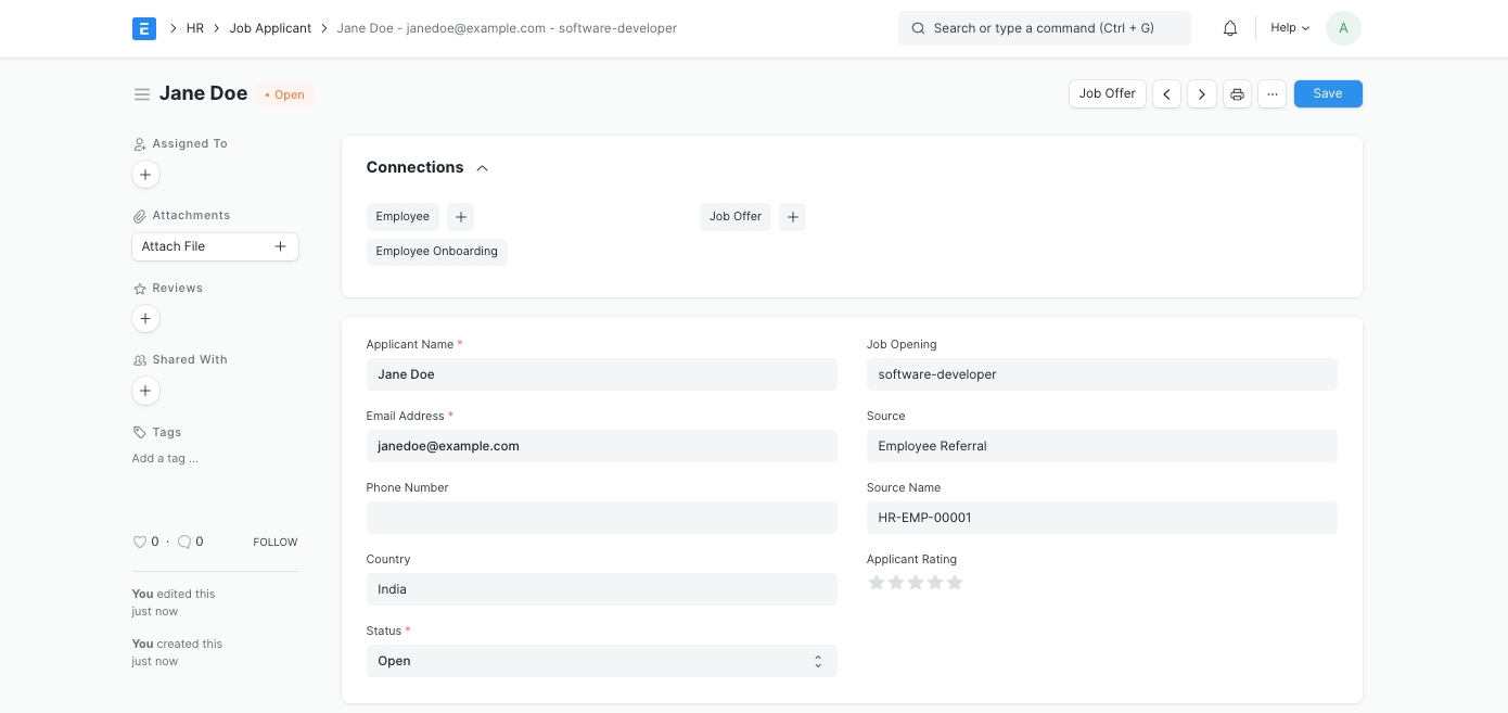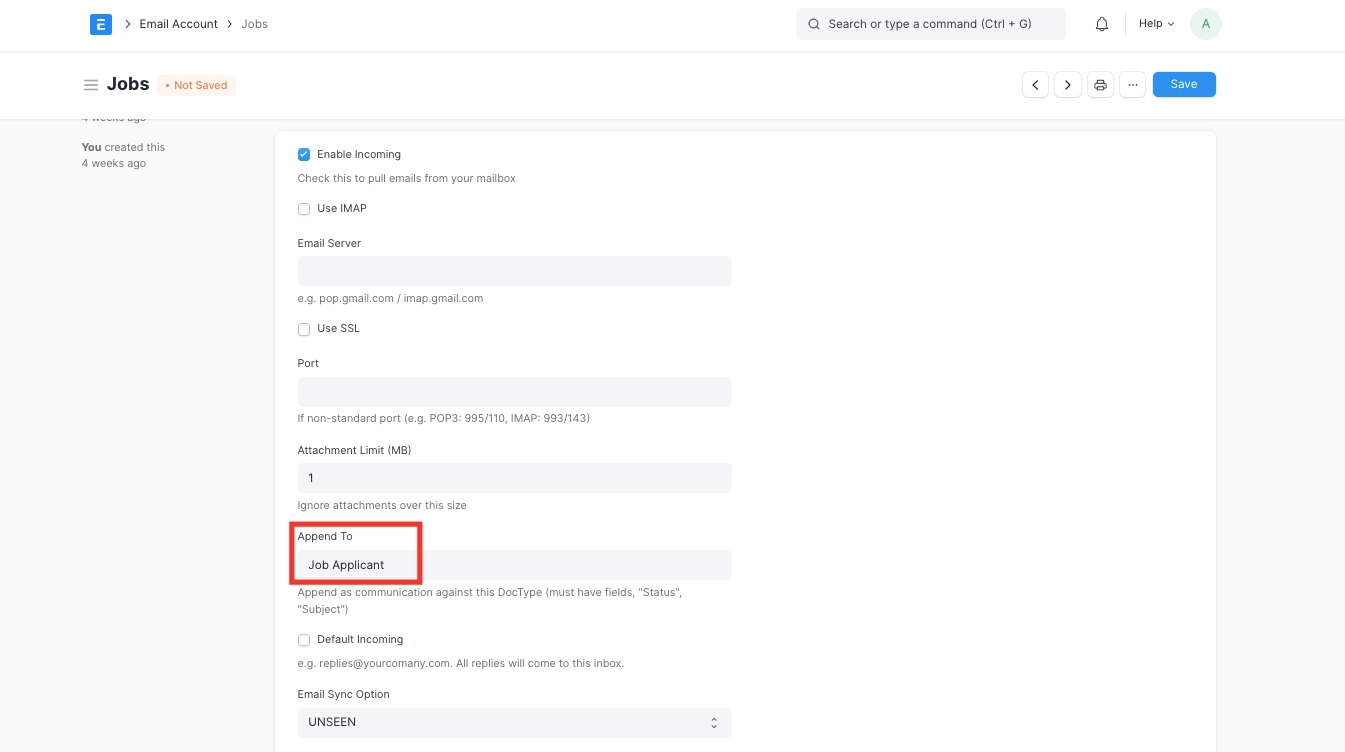 Puede vincular la solicitud de empleo con una cuenta de correo electrónico. Supongamos que vincula la solicitud de empleo con un [email protected] de correo electrónico, el sistema creará un nuevo solicitante de empleo con cada correo electrónico recibido en el buzón.