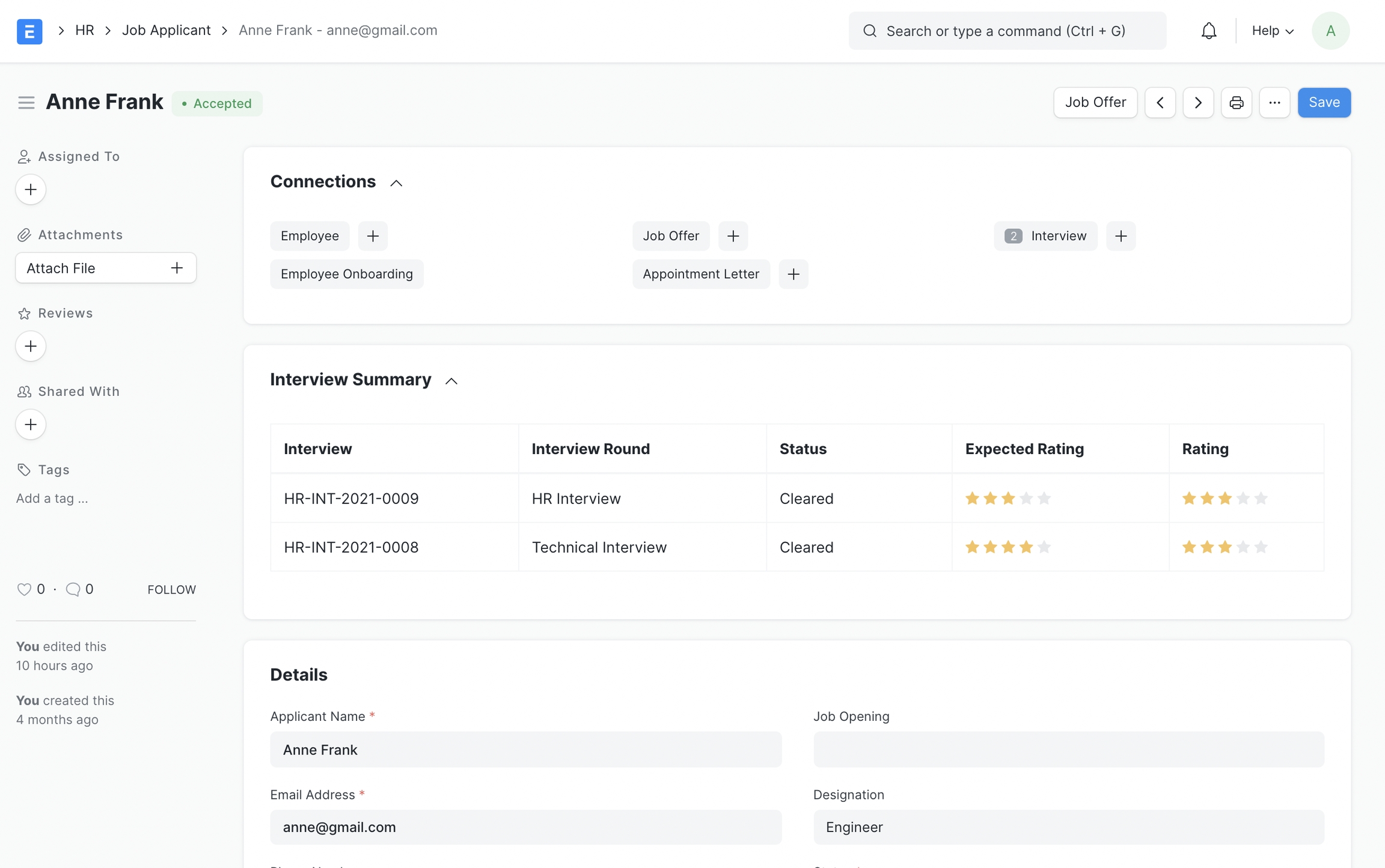 Después de crear entrevistas, puede realizar un seguimiento fácil de ellas dentro del panel de control del solicitante de empleo. Esto le permite comparar todas las entrevistas realizadas con el solicitante y evaluar su rendimiento general para tomar una decisión de aceptación.