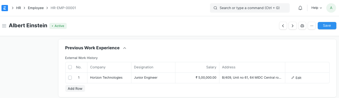 Al igual que la calificación educativa, la experiencia laboral previa de un empleado también se puede capturar en la tabla de historial laboral externo, como se muestra a continuación: