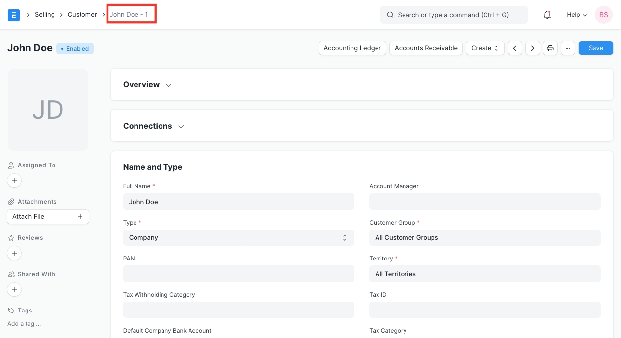 Nombre del cliente: Si el nombre del cliente debe usarse como identificación, seleccione 'Nombre del cliente' en Nombre del cliente por. En este caso, si crea dos clientes con nombres idénticos, - 1 tendrá el sufijo del segundo cliente.